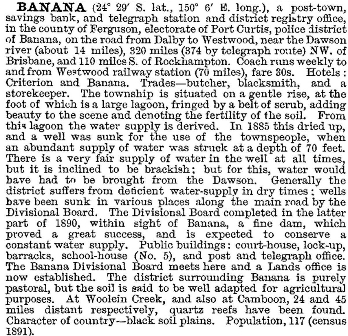Banana, at the intersection of the Dawson and Leichhardt Highways, was chosen as the region's township in 1862. A court of petty sessions and a police lock-up were installed within a year. The Banana local government division (1880) and the subsequent shire were headquartered in Banana until 1930. Banana was described in the 1903 Australian handbook: