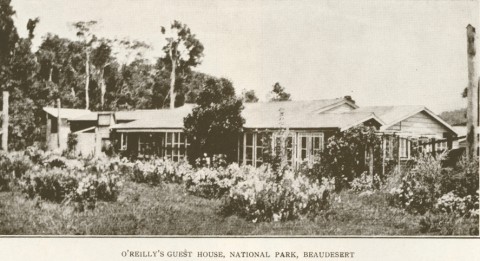 Beyond the reach of the tramway lay the Lamington Plateau. The plateau was proclaimed as a National Park in 1915 after agitation by several prominent residents of the shire. Robert Collins, the son of John Collins who settled at Mundoolun (north-east of Beaudesert) in 1847, was inspired by the American Yellowstone National Park. R.M. Lahey, with timber interests at Canungra, took up Collins' enthusiasm and achieved the proclamation of the National Park which entirely surrounded the O'Reilly family's dairy selection. As visitors came to the National Park, the O'Reillys diversified, opening a guest house in 1926. Bernard O'Reilly's successful 1937 search for a crashed Stinson airliner caught public attention, and his subsequent books published in their thousands, made O'Reilly's a national tourist destination. The Groom family's Binna-Burra Lodge (1933) achieved similar fame. Lahey and Groom were founder members of the Queensland National Parks Association.