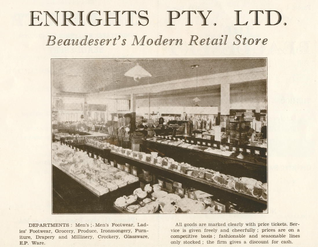 Enrights Pty Ltd, Beaudesert Genre: bookHeadwords: BeaudesertYear Created: 1935Contributor: Centre for the Government of QueenslandCreator: Beaudesert Shire CouncilPublication Title: Official Souvenir Beaudesert and National Park Lamington PlateauPublication Place: BrisbaneTaxonomy upgrade extras: Woorim Read more about Enrights Pty Ltd, Beaudesert