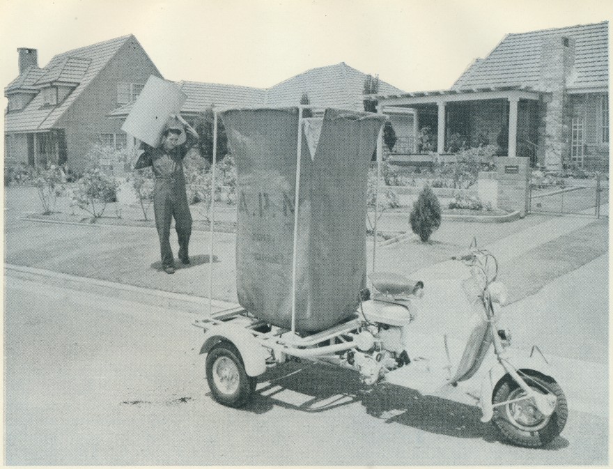 Motor-scooter tricycles in Brisbane used to collect waste paper for the Petrie Paper Mill Genre: bookletHeadwords: Brisbane and Greater BrisbaneYear Created: 1957Contributor: John YoungPublication Title: Paper Talk Read more about Motor-scooter tricycles in Brisbane used to collect waste paper for the Petrie Paper Mill
