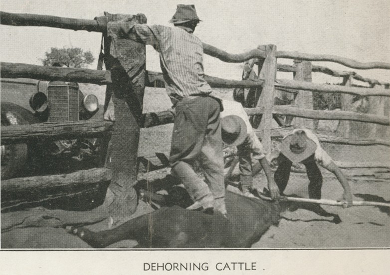 Dehorning cattle, Tobermorey Station, Urandangie Genre: newspaperHeadwords: Barkly TablelandYear Created: 1939Contributor: John YoungPublication Title: The North Queensland Register Read more about Dehorning cattle, Tobermorey Station, Urandangie