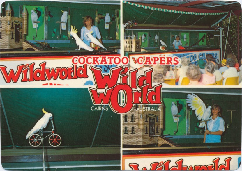 Sulphur Crested Cockatoos performing some of their crazy routines, Cockatoo Capers, Wildworld, Cairns Genre: postcardHeadwords: CairnsYear Created: c1970-2000Contributor: Murray Views Collection Read more about Sulphur Crested Cockatoos performing some of their crazy routines, Cockatoo Capers, Wildworld, Cairns