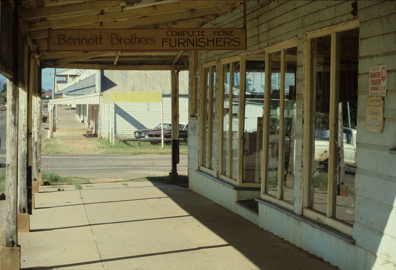 Awning of Bennett Brothers Furniture Shop, Capella Street, Clermont Genre: slideHeadwords: Clermont and CopperfieldYear Created: 1979Contributor: University of Queensland LibraryPublisher: Michael Keniger Read more about Awning of Bennett Brothers Furniture Shop, Capella Street, Clermont