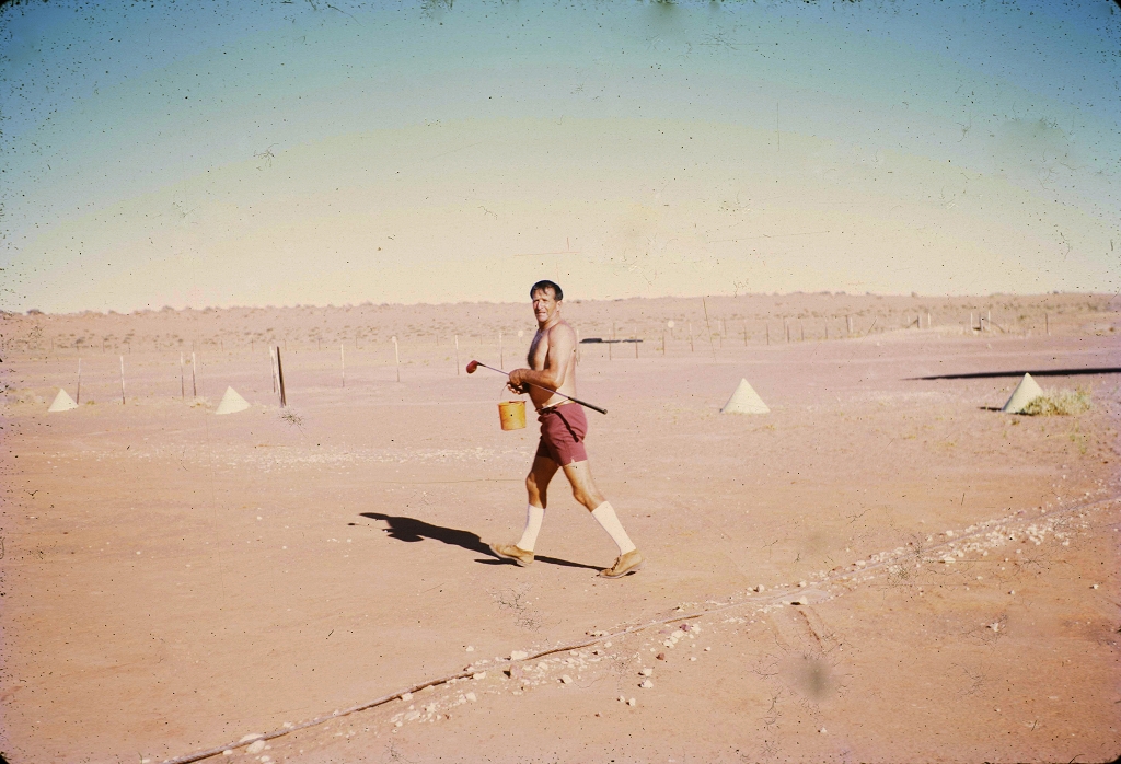 Captain Phil Darby practising golf on the Birdsville airstrip. Kite hawks stole the balls and Captain Darby had to climb the sand hills to retrieve them, Diamantina Shire Genre: slideHeadwords: Diamantina ShireYear Created: 1972Contributor: Dennis Costigan Read more about Captain Phil Darby practising golf on the Birdsville airstrip. Kite hawks stole the balls and Captain Darby had to climb the sand hills to retrieve them, Diamantina Shire