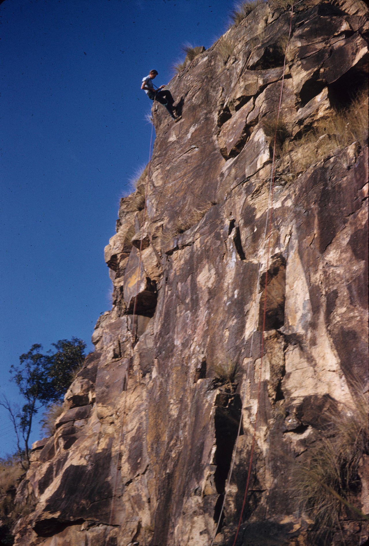 University of Queensland Bushwalking Club (UQBWC) Kangaroo Point Cliffs, Ronald T. Cox, abseiling down cliff Genre: slideHeadwords: Kangaroo PointYear Created: 1959Contributor: Patrick Conaghan Read more about University of Queensland Bushwalking Club (UQBWC) Kangaroo Point Cliffs, Ronald T. Cox, abseiling down cliff