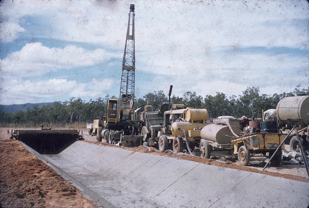 Irrigation channel completed, with equipment, Tinaroo Genre: slideHeadwords: TinarooYear Created: c1950sContributor: Beth Snewin Read more about Irrigation channel completed, with equipment, Tinaroo
