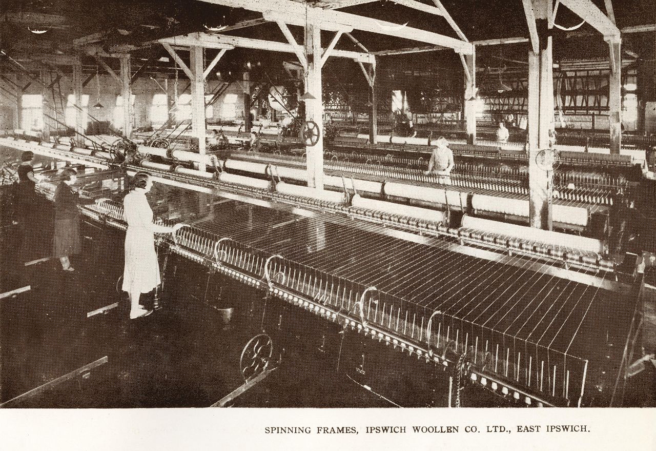 Spinning frames, Ipswich Woollen Co Ltd, East Ipswich Genre: bookHeadwords: East IpswichYear Created: 1934Contributor: Fryer Library, UQPublisher: SL & CoPublication Title: Ipswich and West Moreton Read more about Spinning frames, Ipswich Woollen Co Ltd, East Ipswich