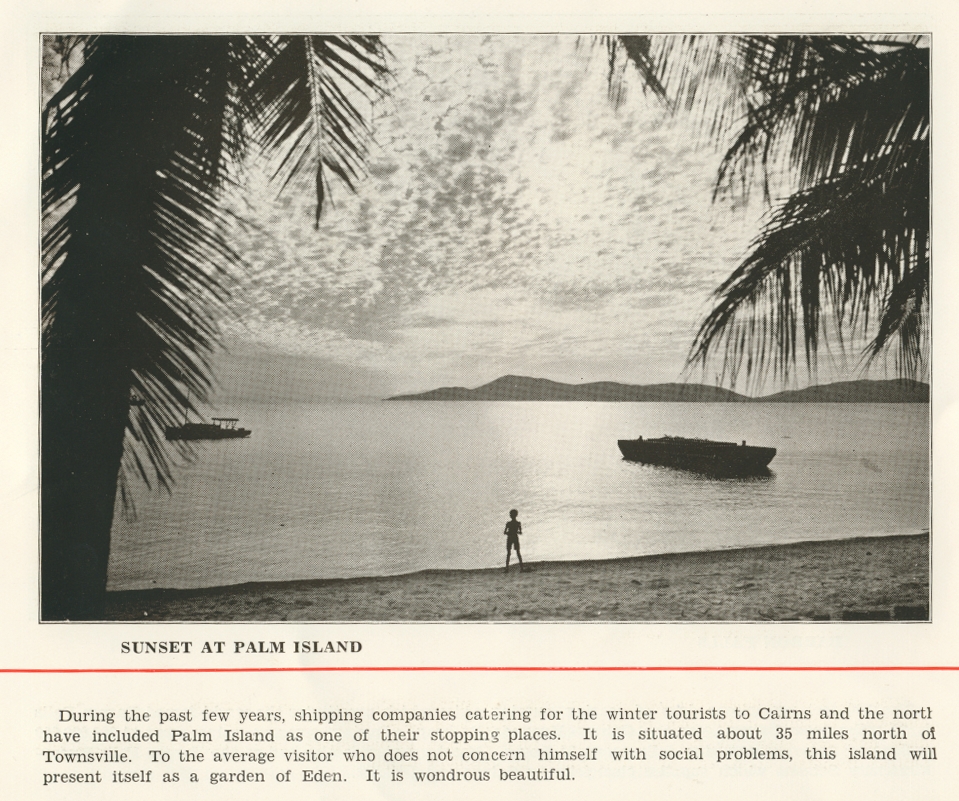 Sunset at Palm Island Genre: bookHeadwords: Palm Island Aboriginal Shire CouncilYear Created: c1935Contributor: Centre for the Government of QueenslandPublication Title: Pictorial Grandeur of CairnsPublication Place: Cairns Read more about Sunset at Palm Island