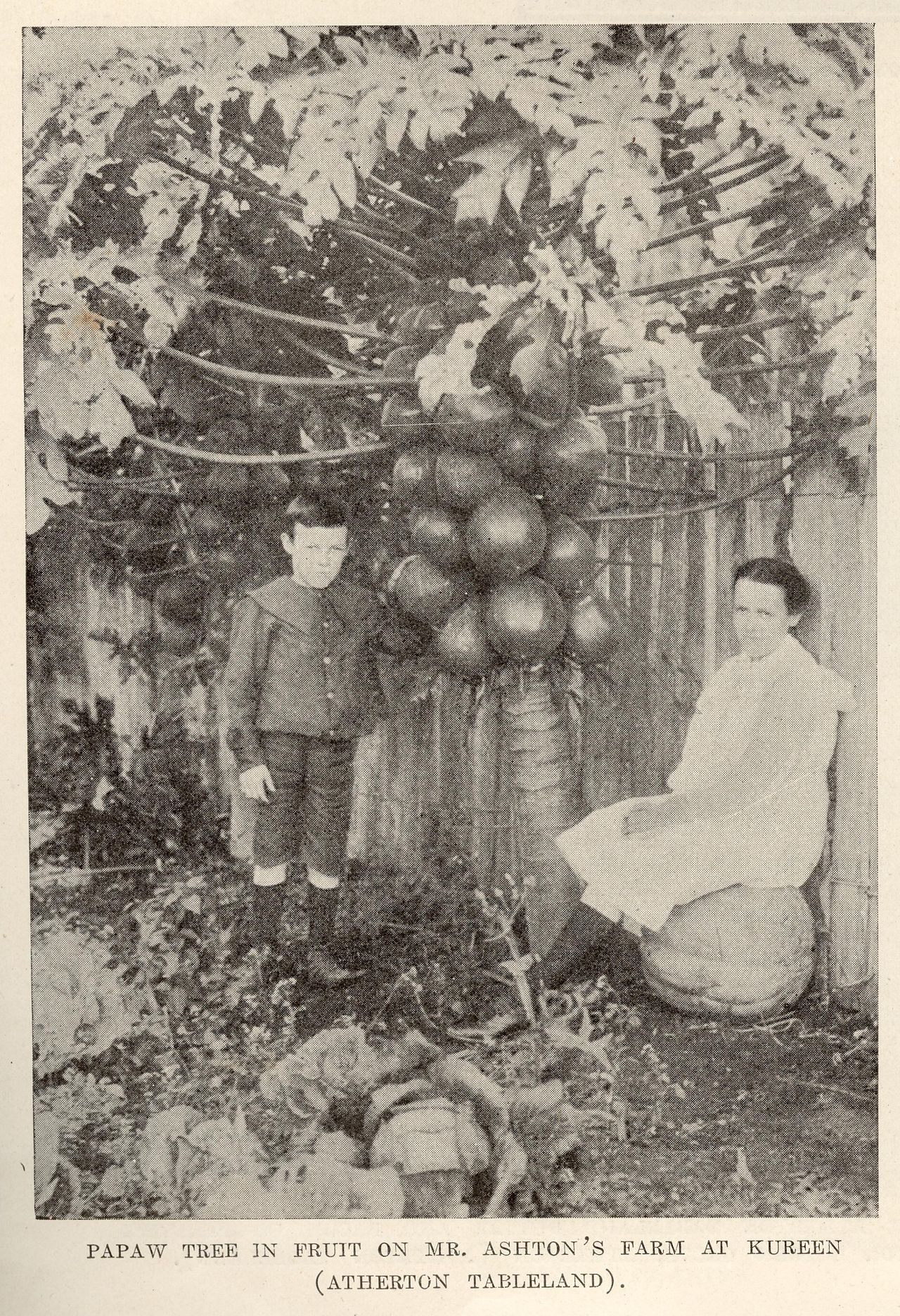 Papaw tree in fruit on farm at Kureen (Atherton Tableland) Genre: bookHeadwords: Atherton Shire and TablelandYear Created: 1918Contributor: Fryer Library, UQPublisher: Queensland Government Intelligence and Tourist BureauPublication Title: Tablelands of North Queensland Read more about Papaw tree in fruit on farm at Kureen (Atherton Tableland)