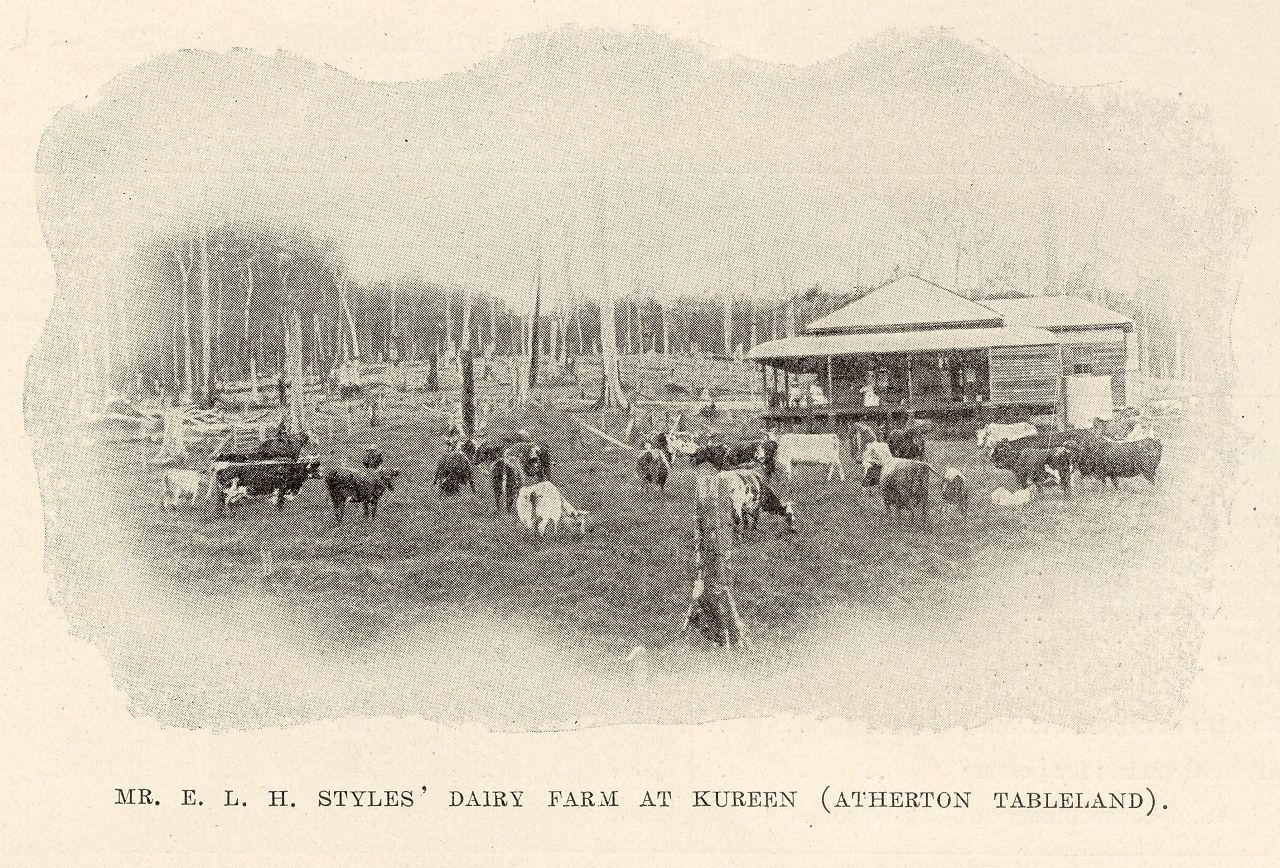 Dairy farm at Kureen (Atherton Tableland) Genre: bookHeadwords: Atherton Shire and TablelandYear Created: 1918Contributor: Fryer Library, UQPublisher: Queensland Government Intelligence and Tourist BureauPublication Title: Tablelands of North Queensland Read more about Dairy farm at Kureen (Atherton Tableland)