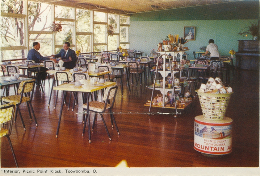 Interior, Picnic Point Kiosk, Toowoomba Genre: postcard folderHeadwords: ToowoombaYear Created: c1960Contributor: Centre for the Government of QueenslandPublisher: Murray Views Pty Ltd Read more about Interior, Picnic Point Kiosk, Toowoomba