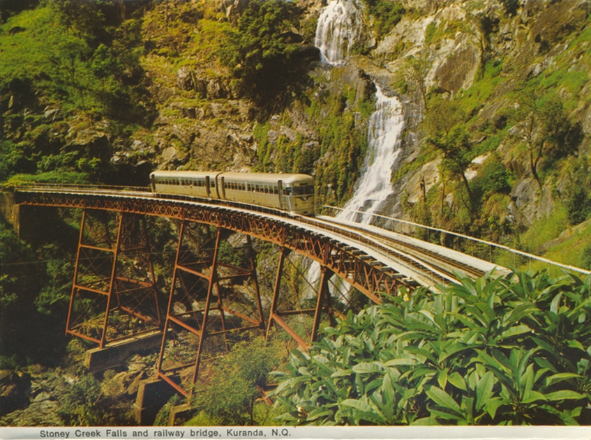 Stoney Creek Falls and railway bridge, Kuranda Genre: postcard folderHeadwords: KurandaYear Created: c1964Contributor: Centre for the Government of QueenslandPublisher: Murray Views Pty Ltd Read more about Stoney Creek Falls and railway bridge, Kuranda