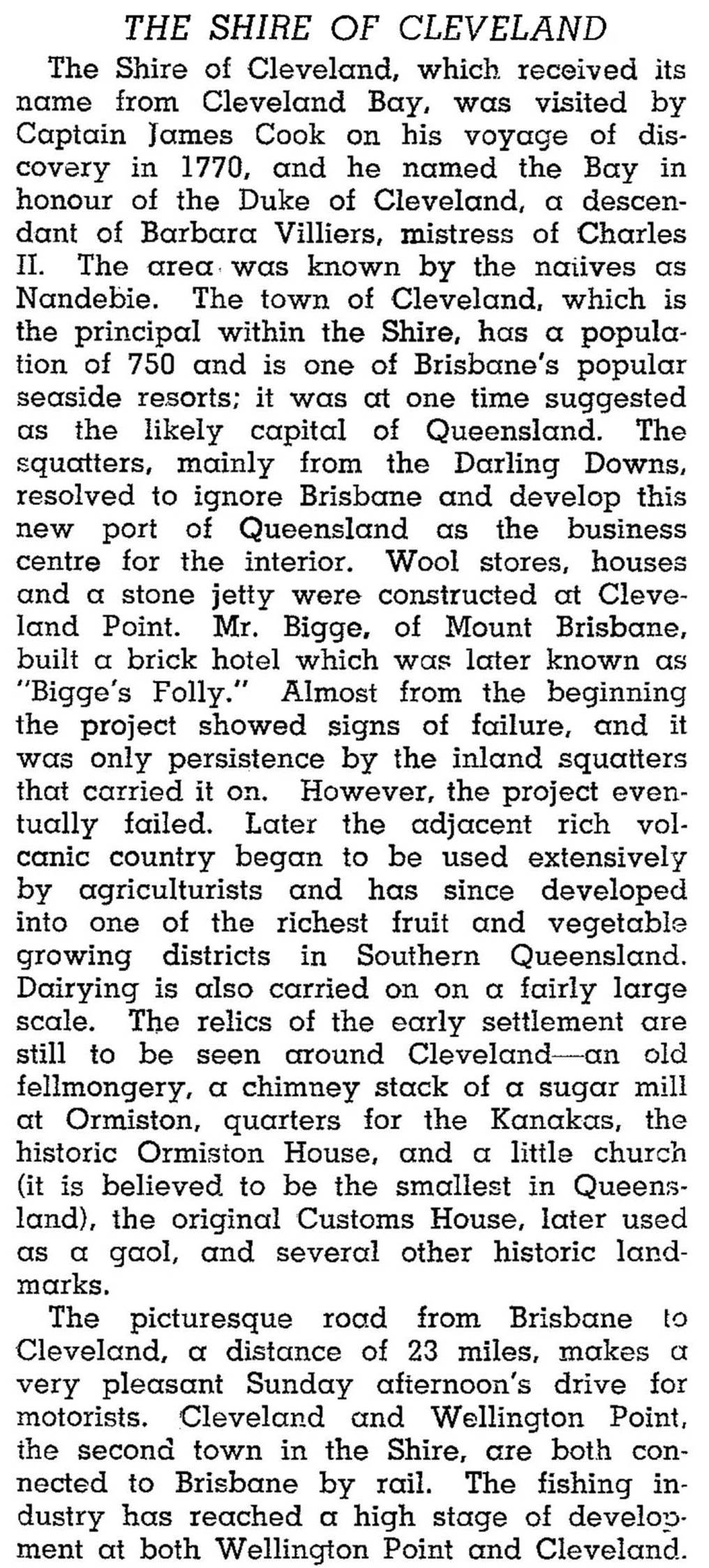 Cleveland Shire, with an area of 28 sq miles, included considerable farmland of good quality. Produce was readily railed to Brisbane, particularly bananas, citrus and strawberries. There were three hotels in the 1920s, upholding Cleveland's reputation as a watering place, as well as several stores and trades people and the office of the Redland Mercury newspaper. With rail access, the Shire's population more than tripled during 1911-47 to nearly 3400. In 1946 the Shire was described in the Australian Blue Book: