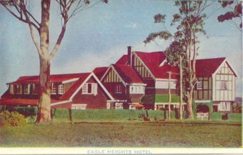 A selector, Cornelius Brady, was the first to take up farm land at Eagle Heights (1879), but the nearest place of settlement was North Tamborine, immediately to the west. After 1918 there was considerable land subdivision on the plateau – the railway had opened in 1918 – and the Eagle Heights subdivision began in the early 1920s. Buyers were weekend visitors and a few permanents. A post office receiving point was opened in 1926, and the spacious Eagle Heights Hotel was opened. A two-storey, Tudor design building, the hotel burnt down in 1964.