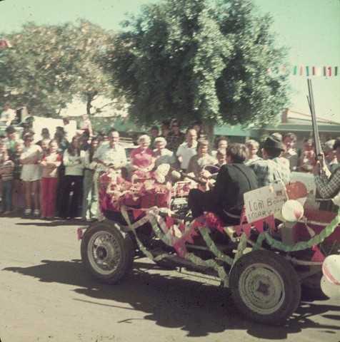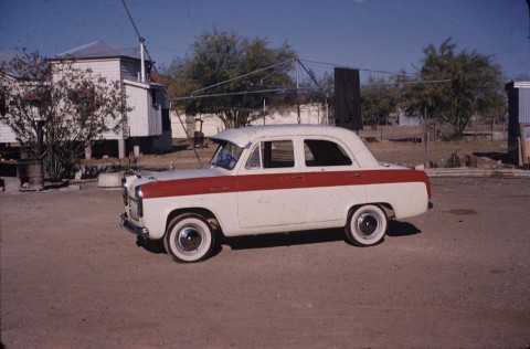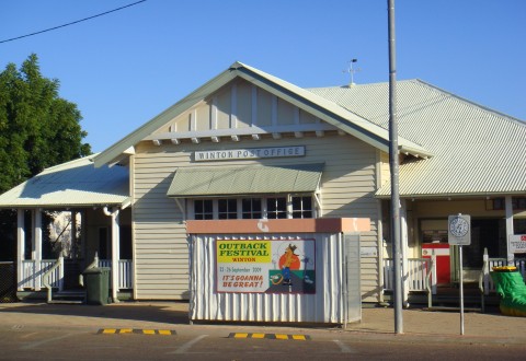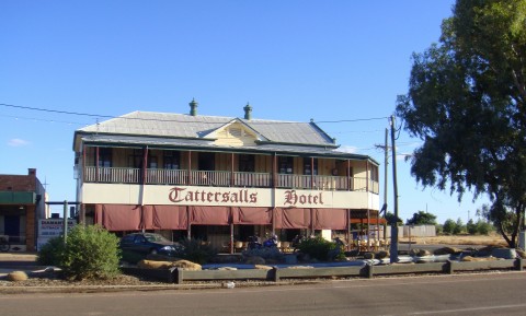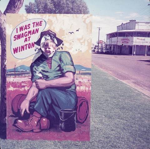 Swagman sign with Central Hotel, destroyed by fire in 1982, Winton