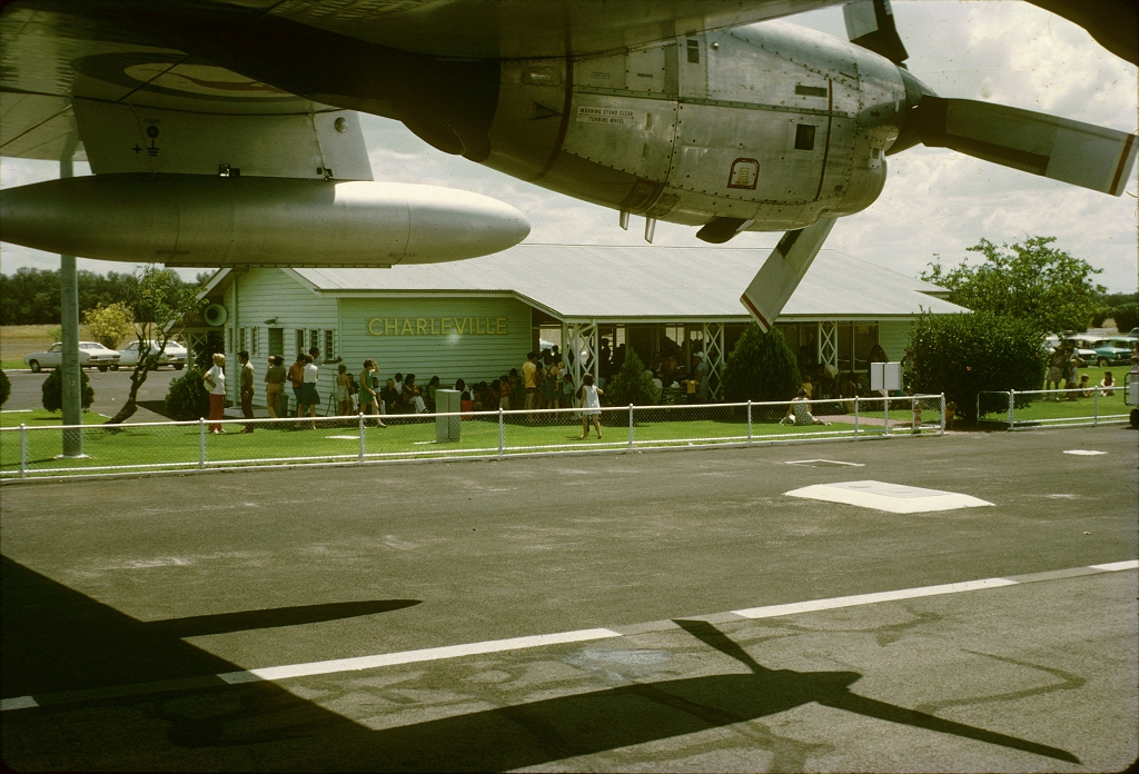 December 1974 refugees from Darwin cyclone Tracy waiting to embark for Sydney on an RAAF C-130 Hercules. Due to engine failure of the aircraft transporting them from Darwin, they had stayed overnight in Charleville