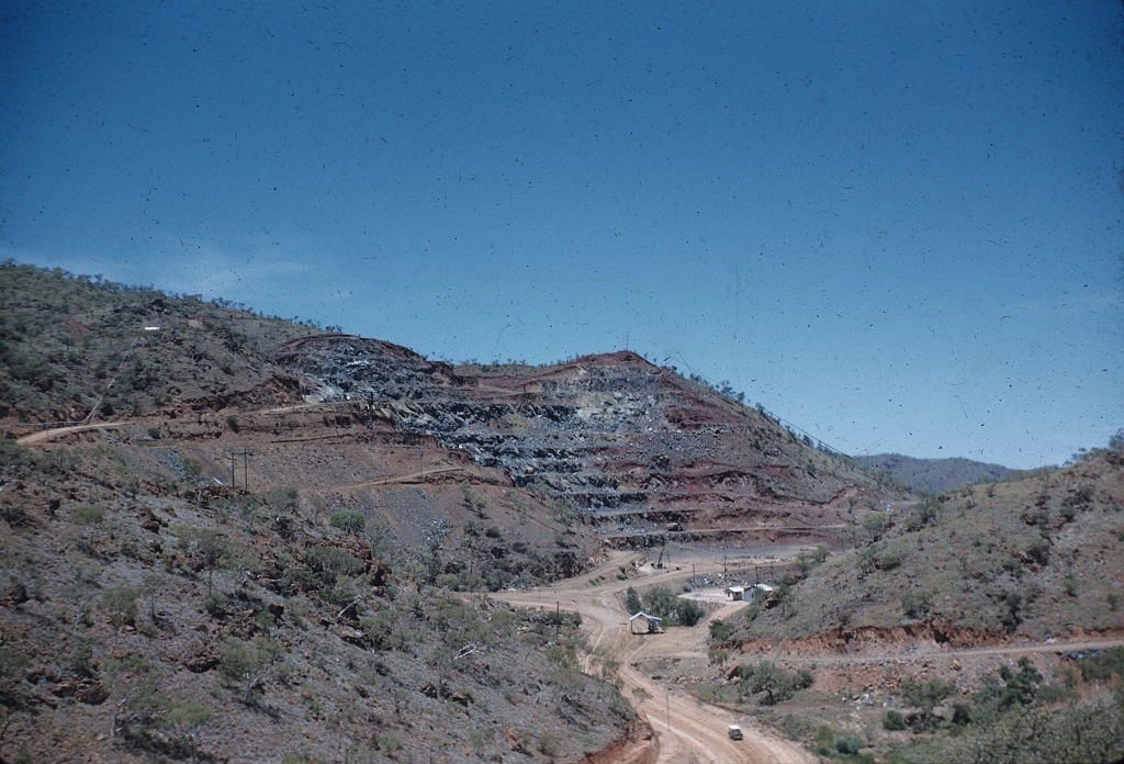 "Benches" of the open-cut, now a large hole containing water, Mary Kathleen