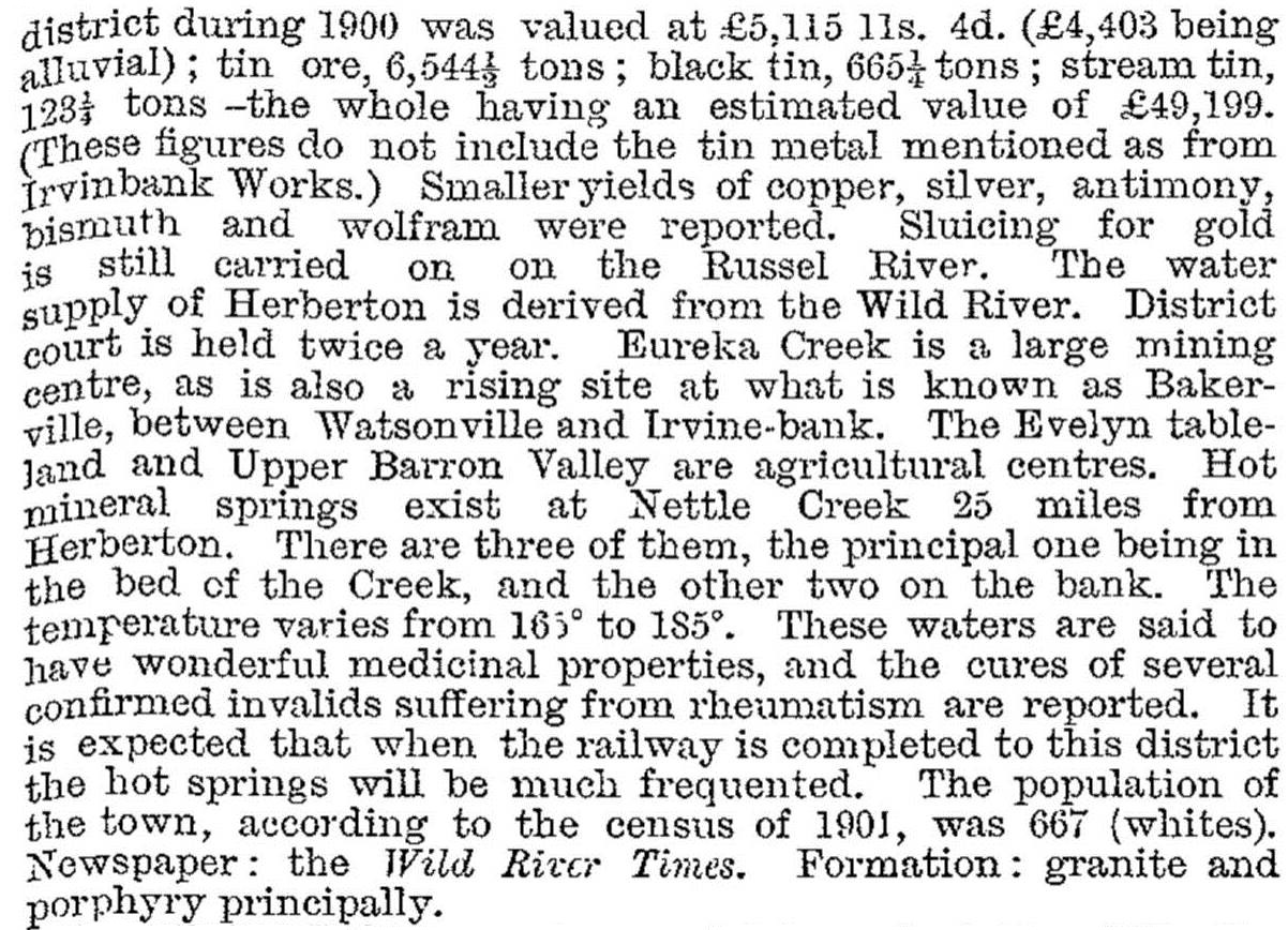 The Post Office directory in 1885 estimated Herberton's population at about 600, and recorded an active township: six stores and sundry other shops such as a pharmacy and a saddler, two banks, three drapers, twelve hotels (but possibly including some outlying establishments), the Wild River Times (1883) and the Herberton Advertiser. There were also Church of England, Catholic and Wesleyan churches, Masonic, Oddfellows, Good Templars, Jockey and Cricket bodies, the Tinaroo Divisional Board and the Tinaroo Progress Association. By 1903 the town's population had nearly doubled, and it was described in the Australian handbook: