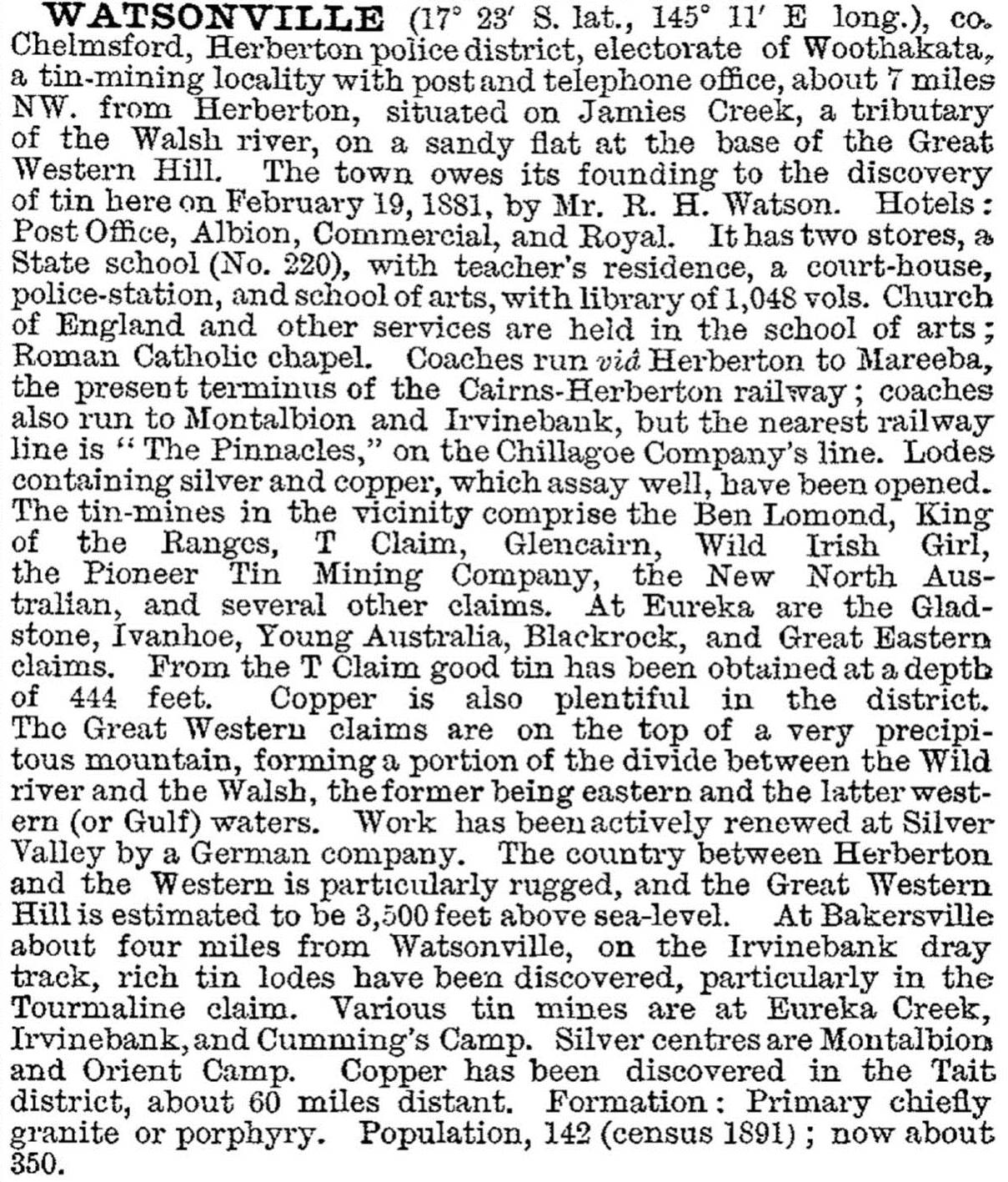 Watsonville, closest to Herberton, originated with the discovery of the Great Western Tin Lode by Robert Watson in 1880. Western Hill is on a direct line between Herberton and Irvinebank. Within two years the Western mining camp was active, and it was surveyed and named Watsonville in 1882. The town was on a sandy flat at the northern base of Western Hill and was the principle centre for several mining camps around it. The post office directory for 1897 recorded three hotels in Watsonville, along with a store, Catholic and Primitive Methodist churches, a billiard saloon, a school of arts and a private school with an average attendance of 51 pupils. Mining was operated in reliance on John Moffat's Irvinebank interests. He opened a quartz battery at Watsonville in 1911, but it lasted for less than a year. Watsonville was described in the 1903 Australian handbook: