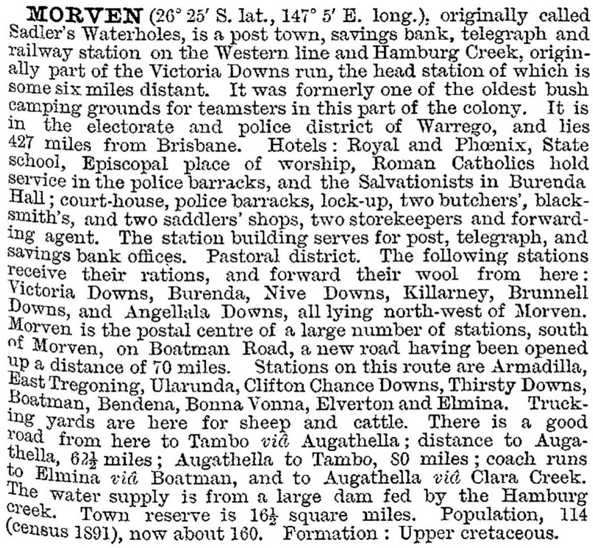 When Charleville was about 15 years old the Murweh local-government division was established (1879). It included Augathella (see separate entry), north of Charleville, and Morven to the east of Charleville. Morven was described in the 1903 Australian handbook: