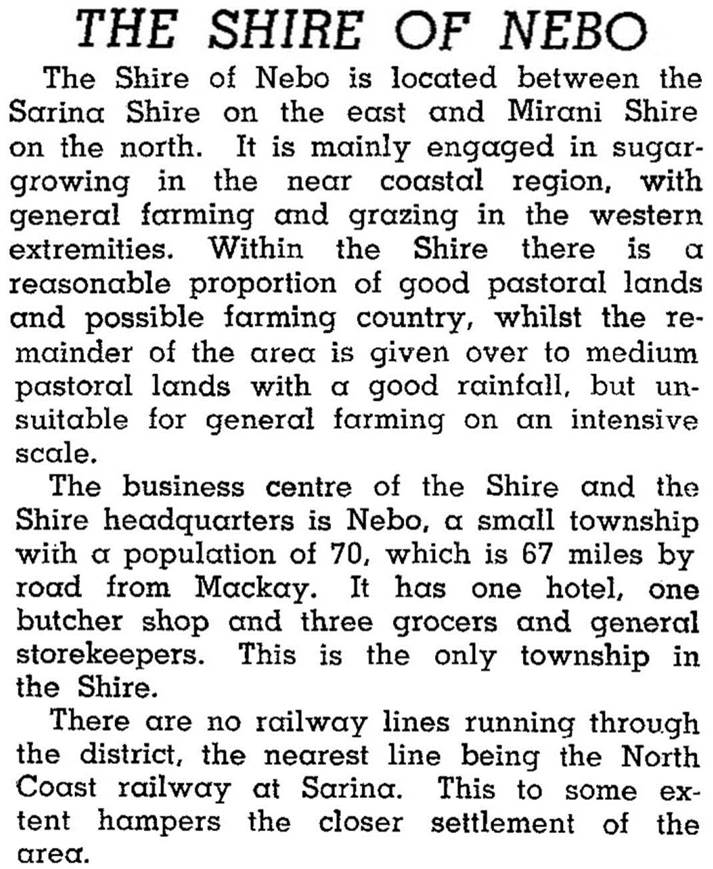 Nebo Shire was described in the 1946 Australian Blue Book: