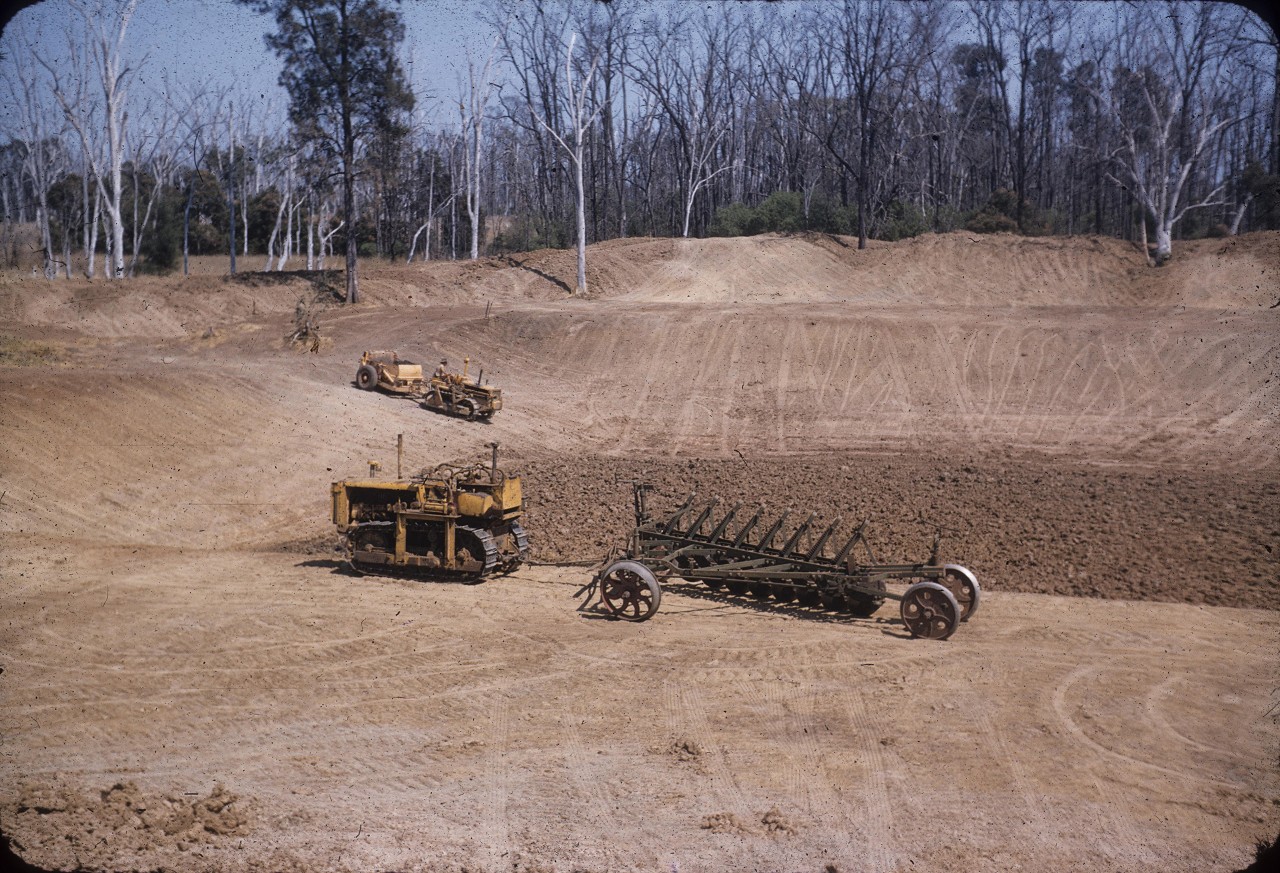Building a tank (dam) with 8 furrow Majestic plough in foreground, Durong