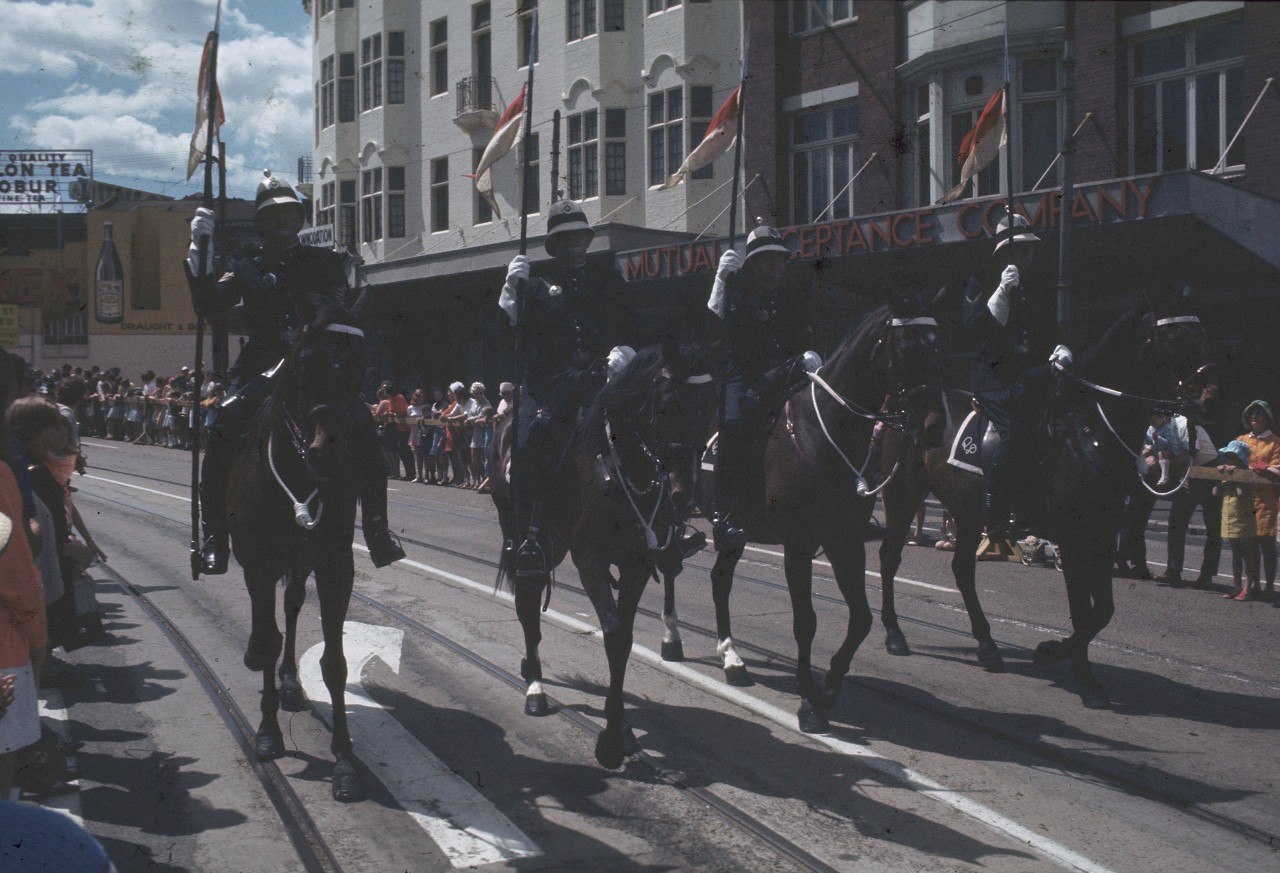 Queensland Mounted Police outside the Atcherley Hotel which burned down in 1980s, Brisbane
