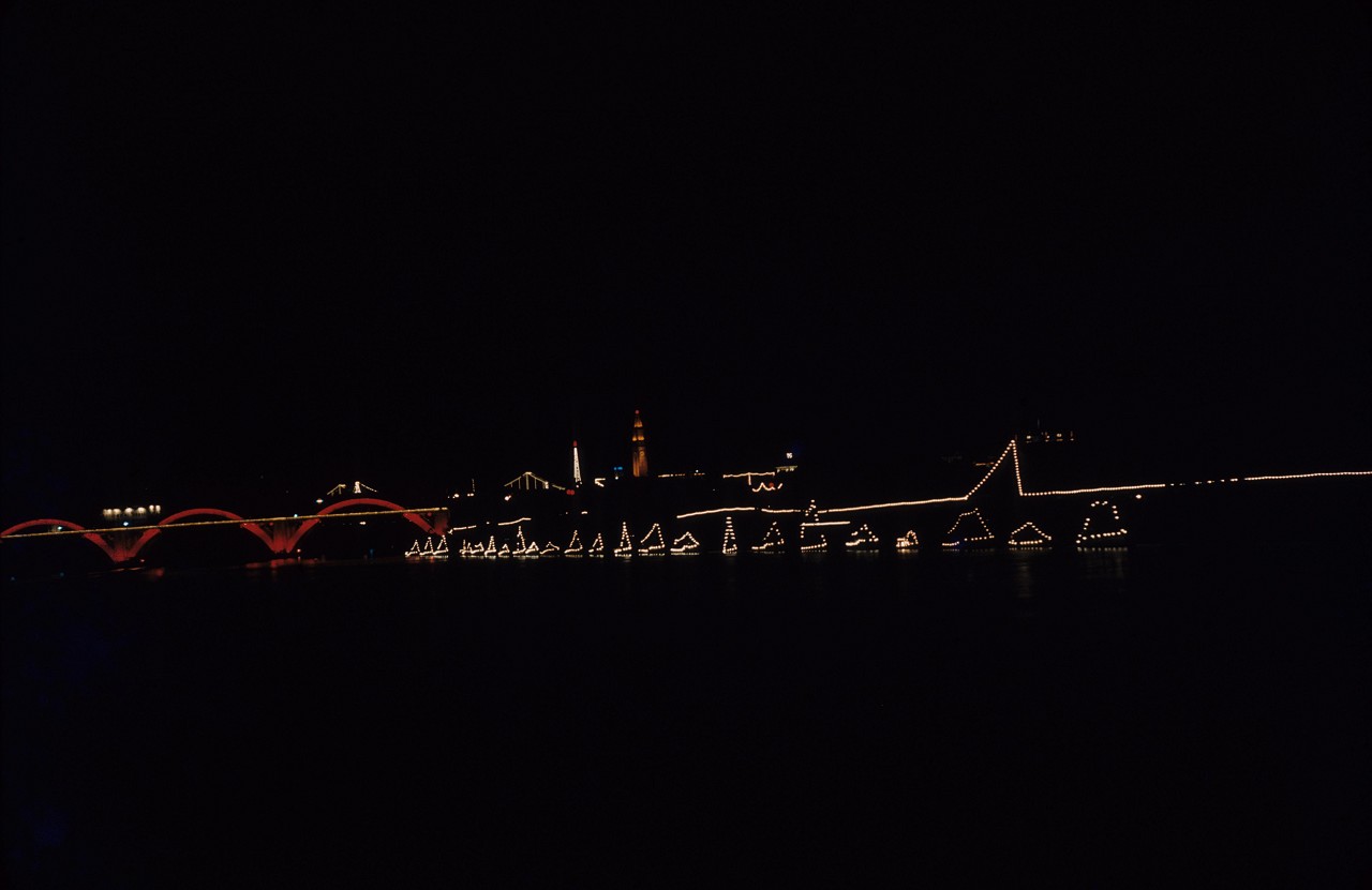 William Jolly Bridge and small boats illuminated for Expo 1988, Toowong Reach