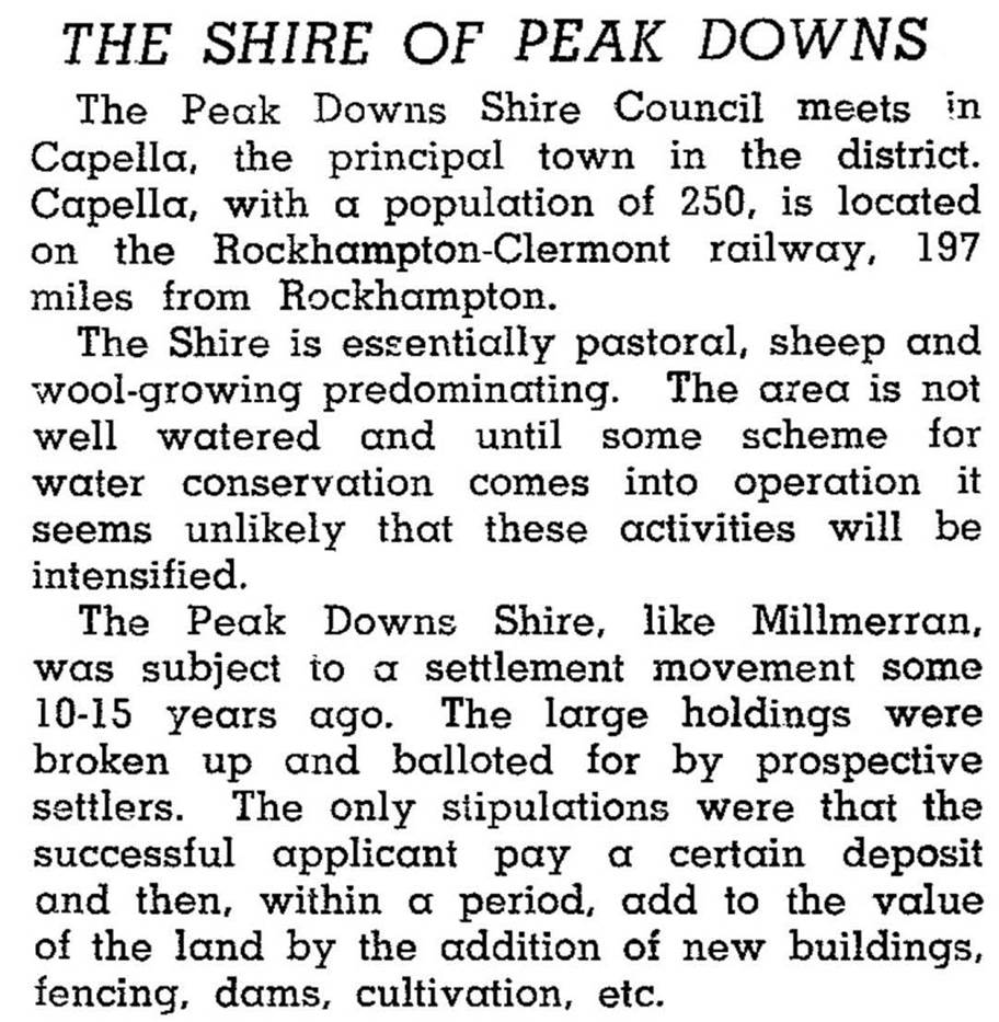 The opening of a railway line through the Shire's (later) administrative centre, Capella, from Emerald to Clermont, in 1882-84 stimulated settlement. Two years later the Peak Downs local government division was severed from the Belyando division. Despite the resumption of some large pastoral holdings several survived well into the twentieth century: Gordon Downs, Retro and Peak Downs homesteads were a testament to their scale and profitability. The fertility of the soil was noted, but dry spells defeated diversification away from sheep grazing into cotton and dairying near the town. The Shire was described in 1946 in the Australian Blue Book: