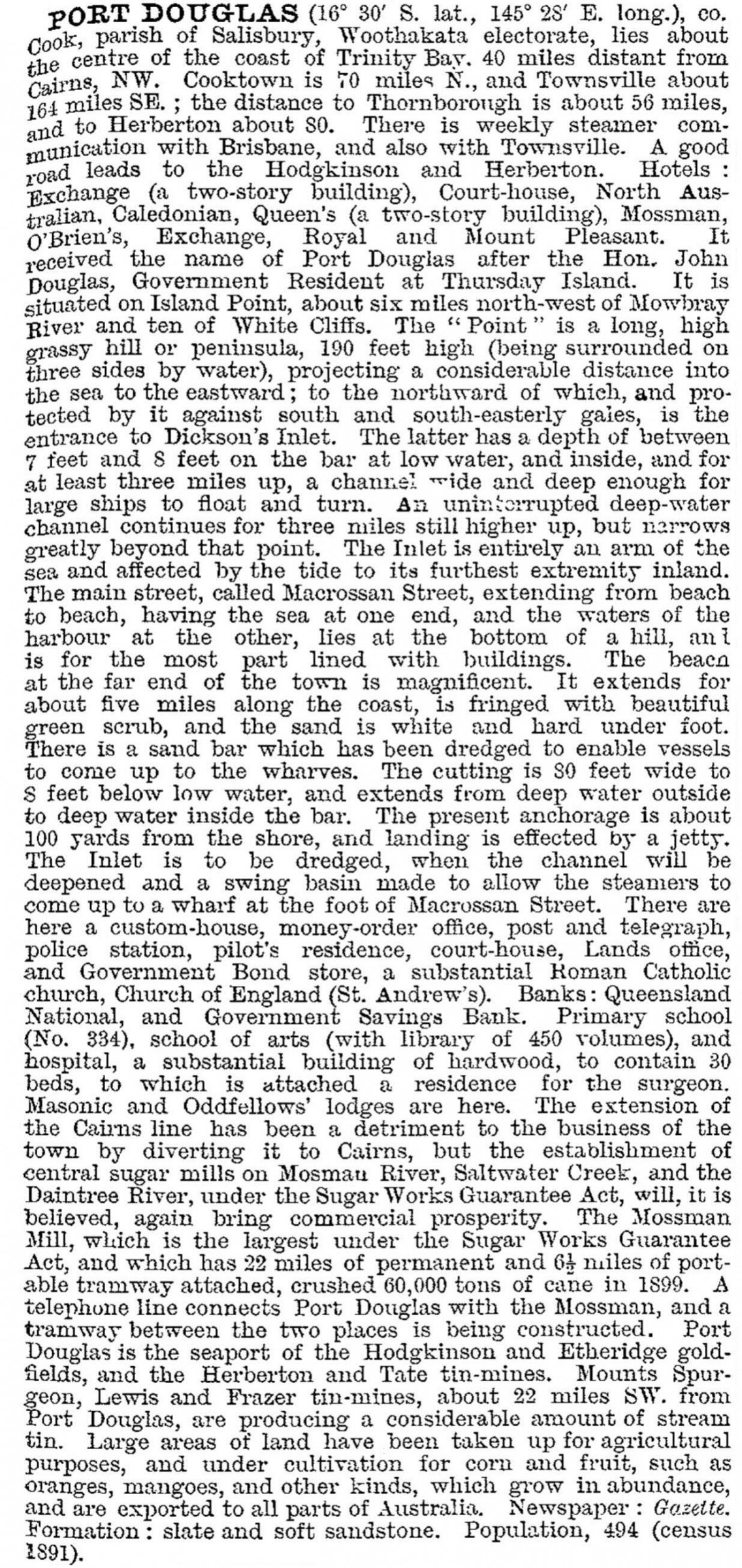 Port Douglas, a coastal resort town, is 60 km north-west of Cairns. It was named after John Douglas, Premier of Queensland (1877-79). Established as a port and then sugar growing area, Port Douglas fell on hard times after the 1911 cyclone. Tourism came to its rescue in the 1980s.