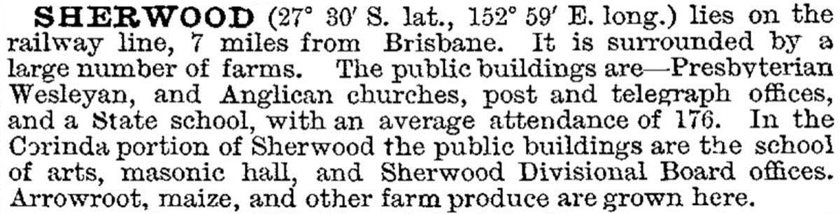 The name Sherwood came to the fore when Sherwood primary school was opened in 1867. Before then it was the name of a farm. The Sherwood Presbyterian church and Orange Lodge Hall were opened in 1875, coinciding with the Ipswich to Brisbane Railway line running northwards to the Albert Bridge river crossing at Chelmer (then Oxley Point). There was a scattering of settlements around the railway stations, including a school (1870) and a court house (1874) at Oxley, further south. The Yeerongpilly division brought local government to Sherwood and Oxley in 1878.