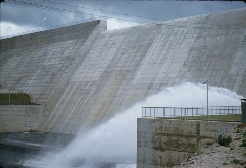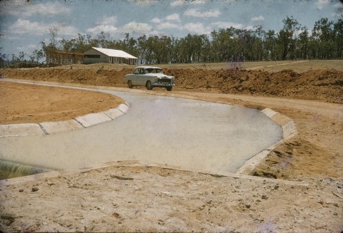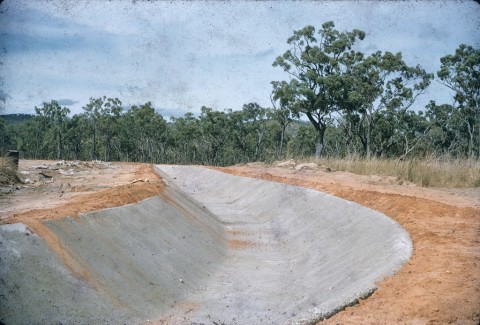 A construction township within walking distance of the worksite was built to accommodate over 700 employees, with 240 dwellings for married personnel. The township included meeting and recreation halls, medical facilities, a shopping centre, a school and a police station. Work was completed in 1958 when the spillway began operation. Irrigation waters run through 600 km of main and distribution channels to the west beyond Dimbulah and to the north through Mareeba and beyond Bimboohm. At the time of commissioning, 1100 farms comprising 53,000 ha were irrigated.